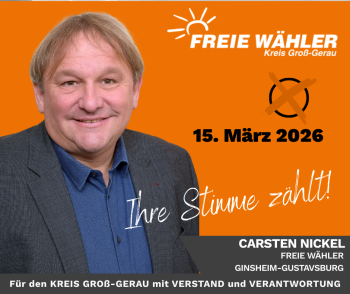 Carsten Nickel (geb. 06.10.1969) lebt in Ginsheim-Gustavsburg, ist Vater zweier Kinder und Diplom-Pädagoge, Sozialwissenschaftler sowie Verwaltungsfachwirt. Seit fast 20 Jahren ist er kommunalpolitisch aktiv, lange für die SPD, seit Oktober 2025 für die Freien Wähler. Er war unter anderem Fraktionsvorsitzender, Mitglied im Haupt- und Finanzausschuss und ist heute stellvertretender Vorsitzender der Stadtverordnetenversammlung.